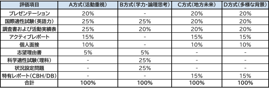 英語や調査書の比率が各20%に下がり、その分「レポート」の比率が30%(アクティブ+特有レポート)と高く、AB方式と比較してもより「個人」にフォーカスの当たった配点割合になります。