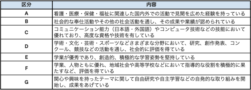 ここがA方式の最大の特徴です。評定平均の足切りはありませんが、以下のA〜Gのうち少なくとも1つに自信を持って該当できるかが問われます。